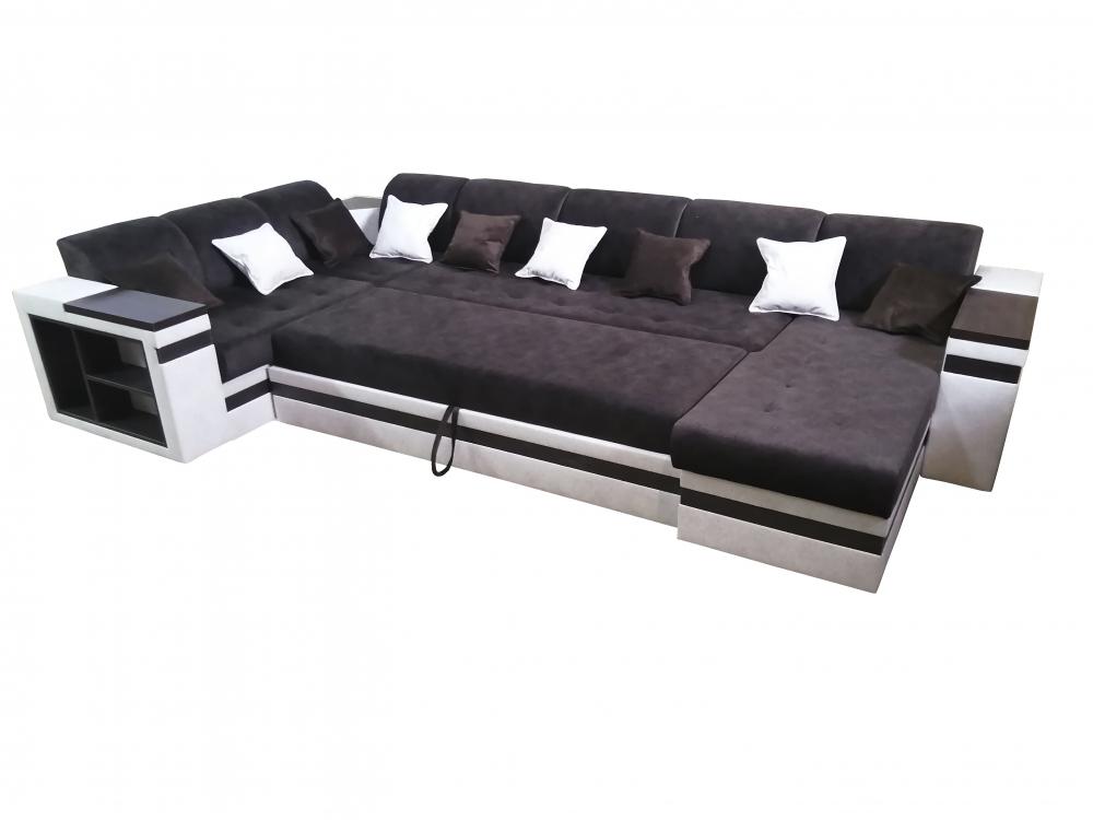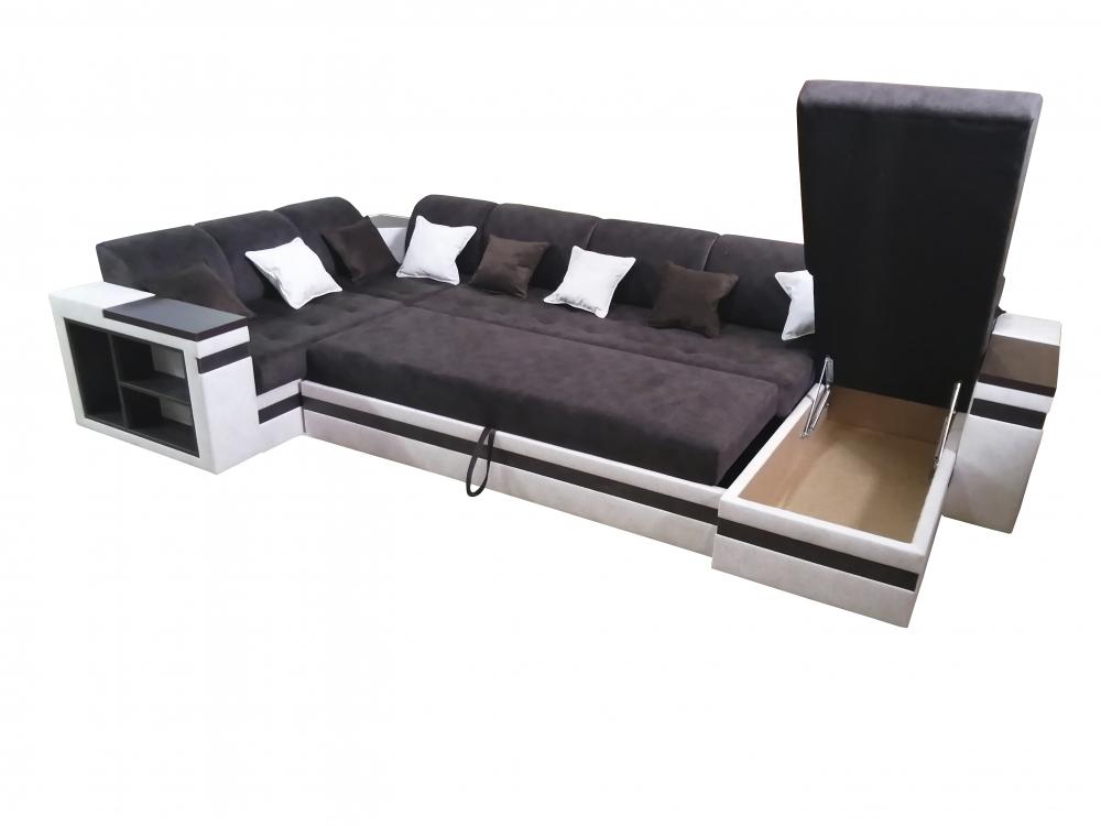 П-образный диван Престиж Отто оформлен в синих,белых и темных тонах с раскладным механизмом дельфин.Диван имеет боковые полки и вставки черного цвета и атаманку.Диван траснформируется в кровать.