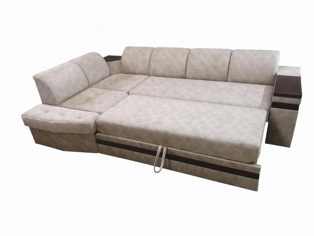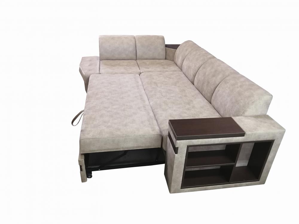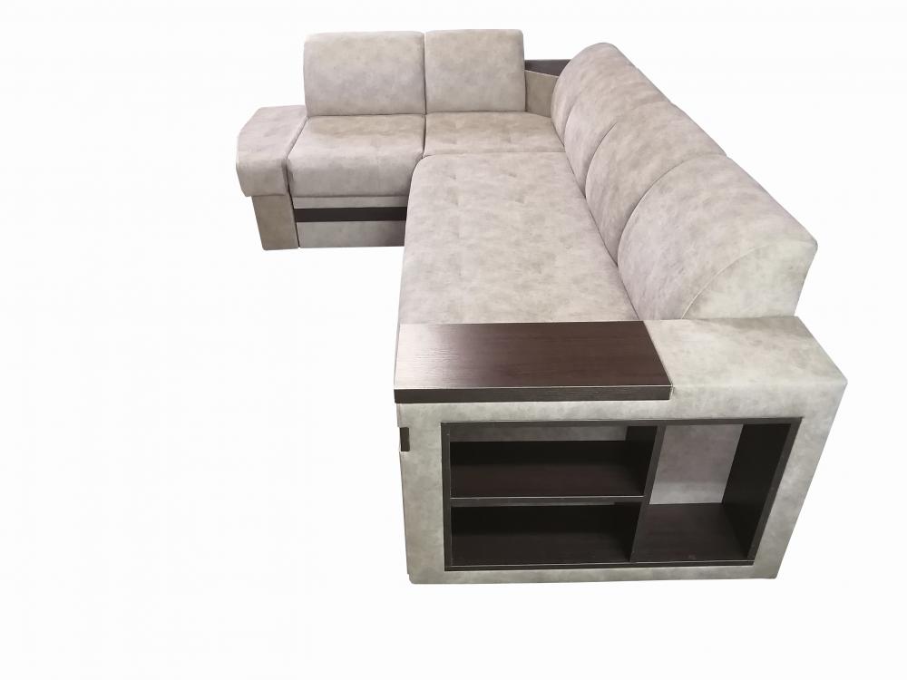 Угловой диван с комбинированной обивкой. Встроенные полка в подлокотнике и 2-ой подлокотник в ввиде пуфика.Данный диван можно изготовить в любом размере и цветовой гамме.