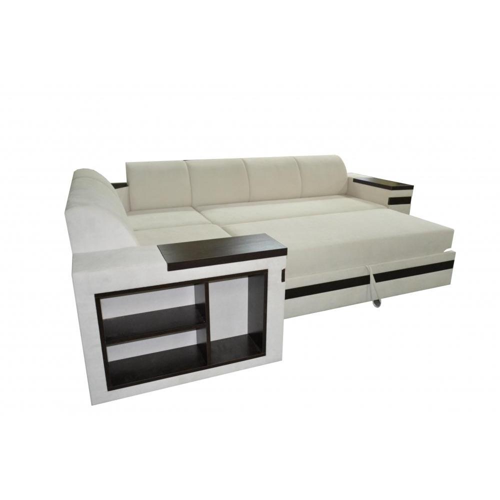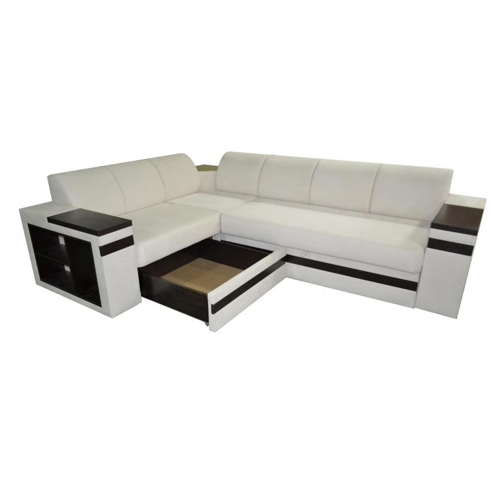 Диван Soft Style «Престиж 1» – это стильная угловая модель с функциональным дизайном. Данный образец перетянут тканью белого цвета. Подлокотники декорированы деревянными накладками в цвете «Венге темный». В боковины встроены полки для удобного хранения книг и журналов. Имеется также ящик для хранения постельных принадлежностей. Диван оборудован механизмом трансформации «Дельфин» и легко раскладывается в просторное спальное место.