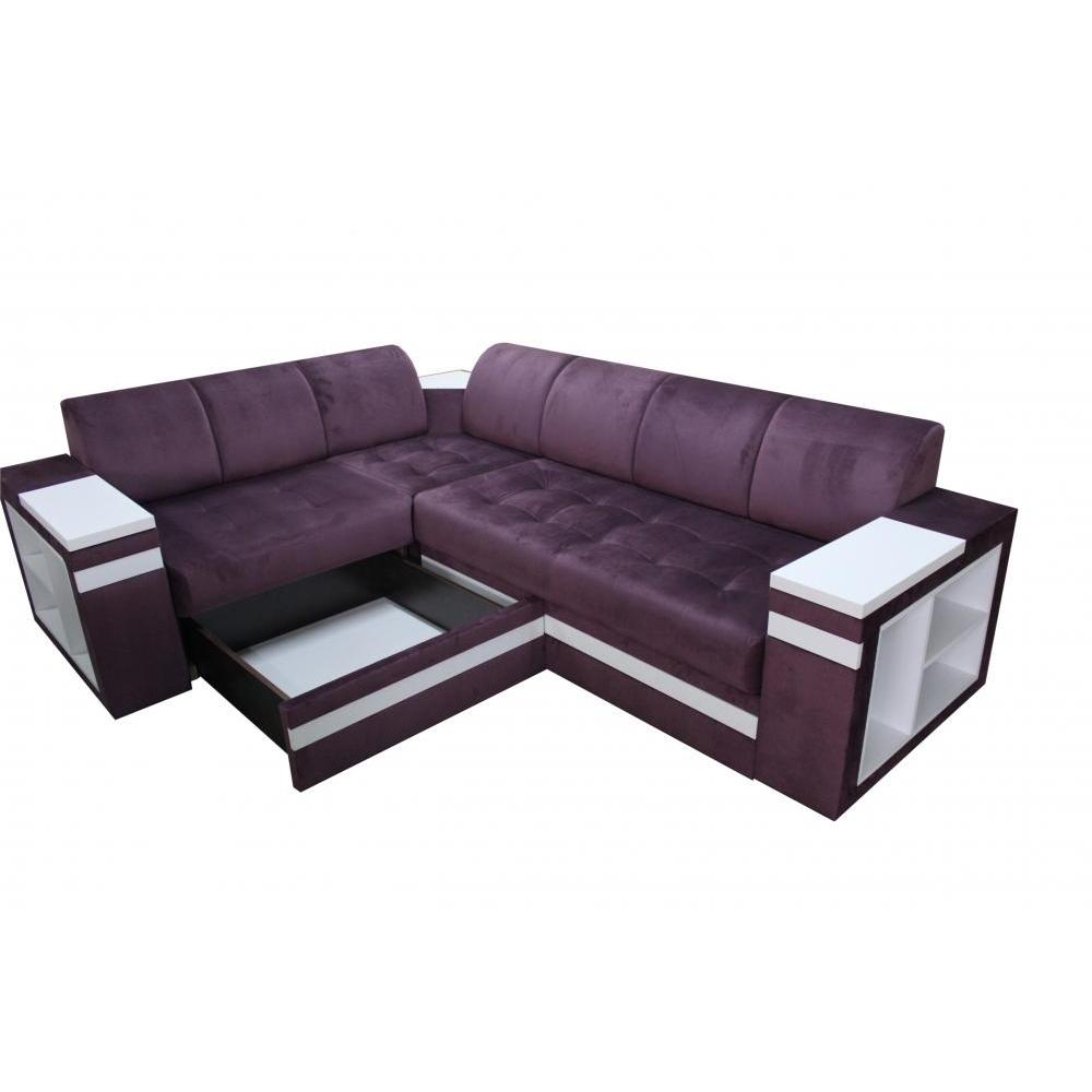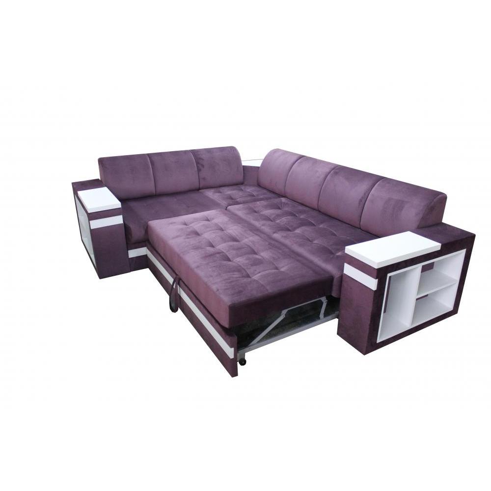 Современный угловой диван с открытыми полками. Просторное спальное место и о