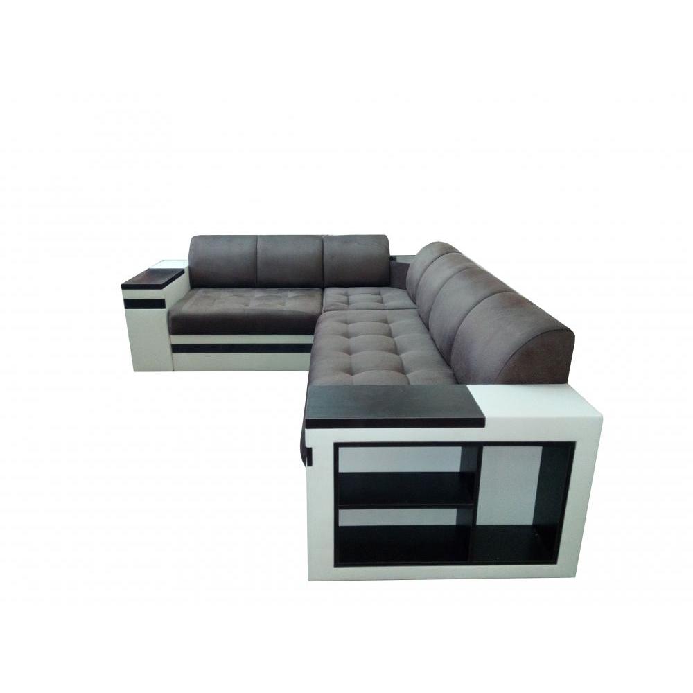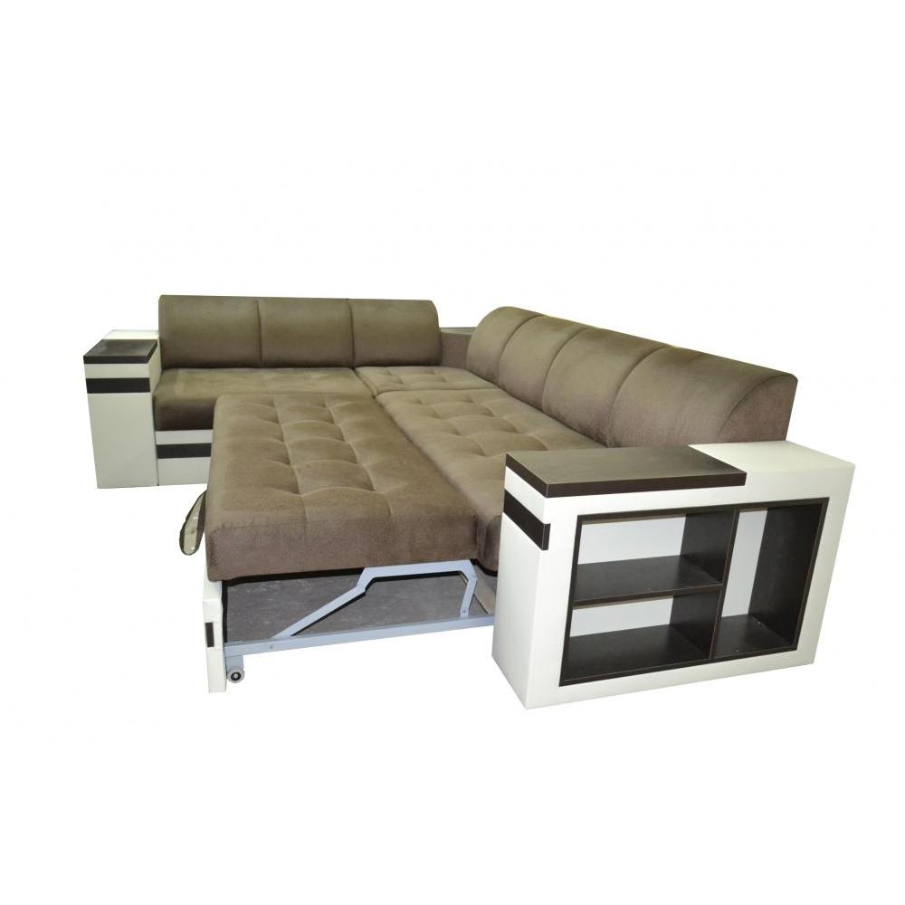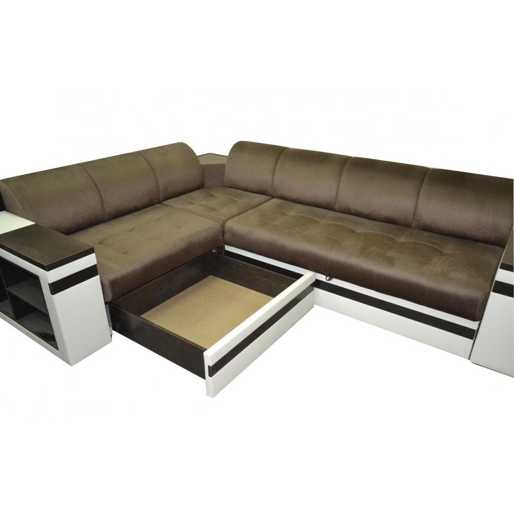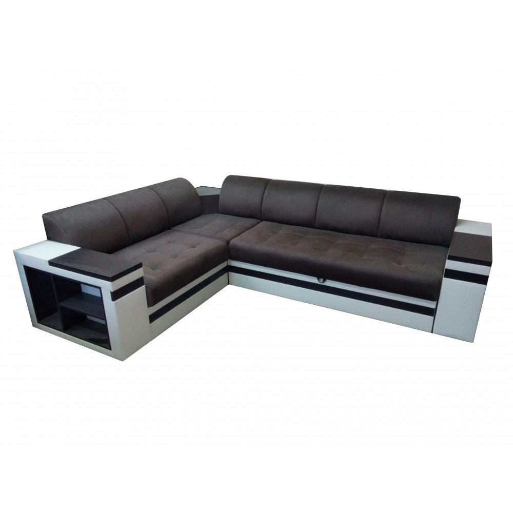 Компактные модульные спинки имеют стильный и удобный полукруглый профиль, а сиденья прошиты в легкой квадратной стяжке. Светлый корпус дополнен черной полоской по основанию и контрастными накладками на подлокотниках и встроенными полками под темное дерево. Также функциональное основание вмещает ящик для хранения постельного белья и практичный выкатной механизм для установки спального места типа \"Дельфин\". Обивка на фото представлена в бархатистом варианте серого цвета и в расцветке топленого молока.