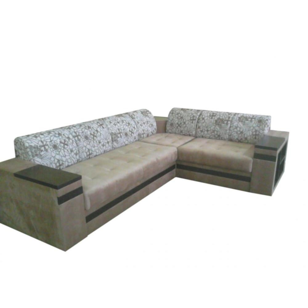 Угловой диван-кровать со встроенными полками. Цветочная обивка спинки из жаккарда.