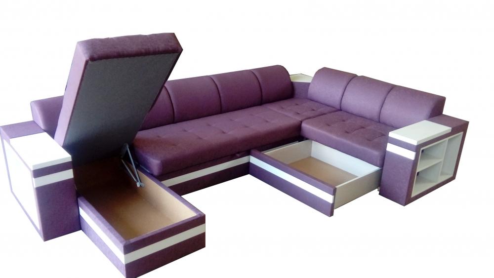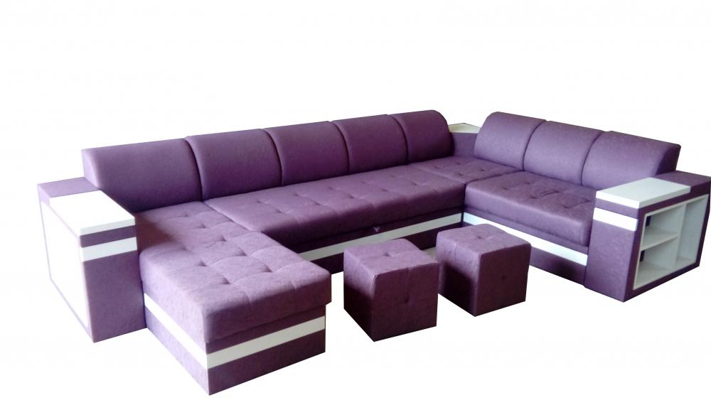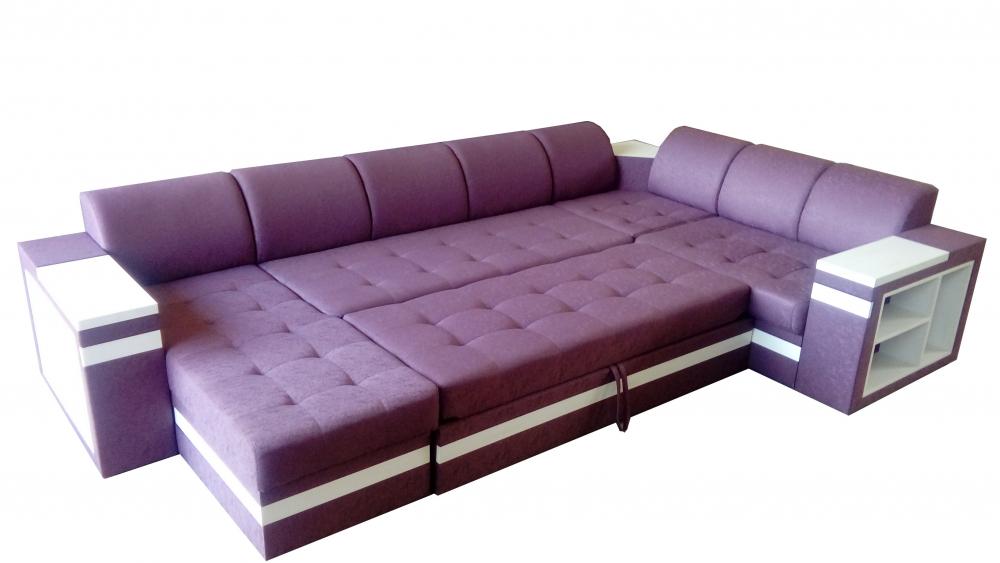 П-образный диван Престиж Отто оформлен в лиловом цвете с раскладным механизмом дельфин.Диван имеет боковые полки и вставки белого цвета.Диван траснформируется в кровать.С диваном идут пуфики такой лилового цвета.