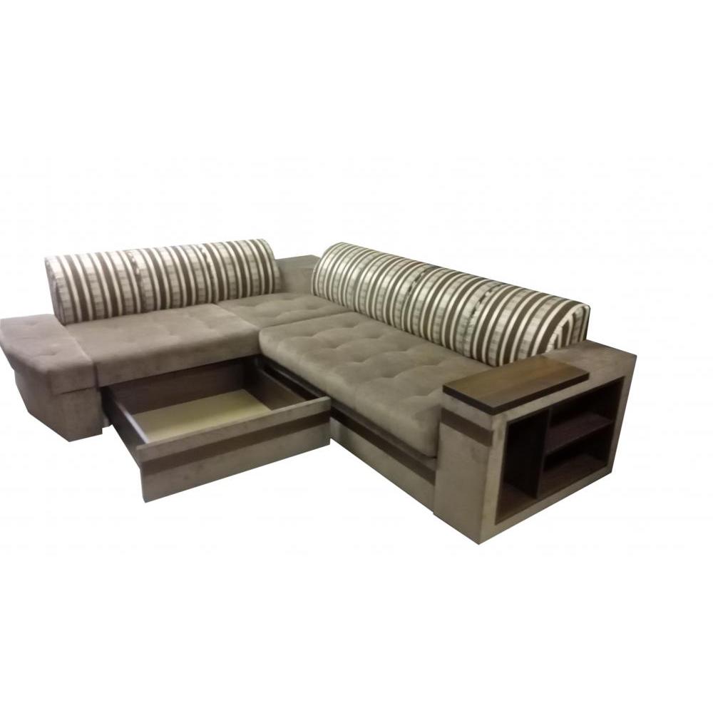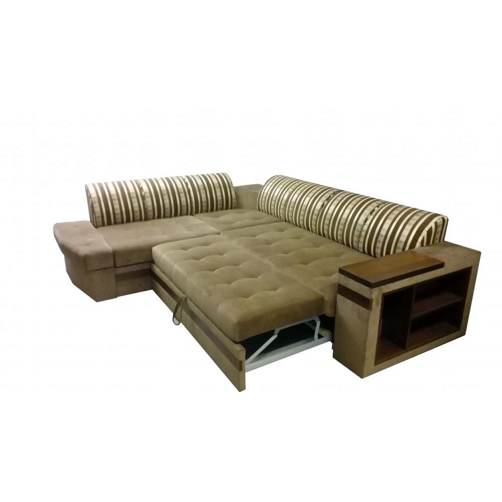 Угловой диван с комбинированной обивкой. Встроенные деревянные полки.